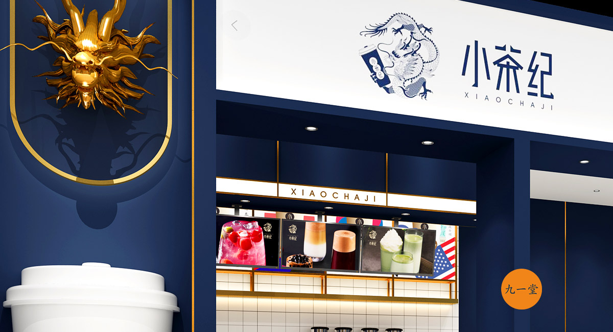 一葉神奇的東方樹(shù)葉,成為了風(fēng)靡世界的中國(guó)潮。中國(guó)是茶的故鄉(xiāng),成都是茶文化的起源地。小茶紀(jì),創(chuàng)建于成都,用一杯小茶紀(jì)成為風(fēng)靡世界的東方美茶潮流。在小茶紀(jì)的空間設(shè)計(jì)上采用深藍(lán)和金色色調(diào),體現(xiàn)小茶紀(jì)品牌的沉穩(wěn)的性格,但有沒(méi)有摒棄此品牌時(shí)尚的氣質(zhì),大面積鈦金的收邊提升了品牌整體品質(zhì)。門(mén)頭的形象墻采用龍頭的設(shè)計(jì)契合項(xiàng)目的品牌定位,體現(xiàn)出大國(guó)的豪邁,白色杯子的運(yùn)用使得整個(gè)空間時(shí)尚感十足。并且龍頭和杯子的運(yùn)用在此空間中十分搶眼,是整個(gè)空間的點(diǎn)金之筆。