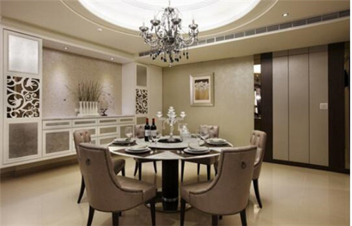 假如您家里的空間允許的話,那么就可以單獨(dú)隔出一個(gè)區(qū)域作為餐廳了。圖中是一款非常雅致的餐廳,頗具層次性的設(shè)計(jì),讓餐廳的典雅平衡入口處的華麗氣勢(shì),尤其古典美的圓弧天花、餐桌,細(xì)致的線條層層圍起,柔化了視覺沖擊力,并以金貝沙石材為臺(tái)面,帶出古典質(zhì)感。